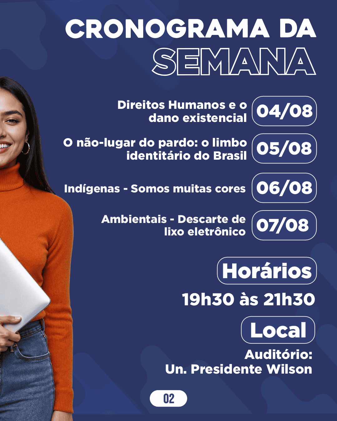 De 04 a 07 de agosto, a Fatef realiza palestras com a Semana de Temas Transversais, no auditório da unidade Presidente Wilson, às 19h30.