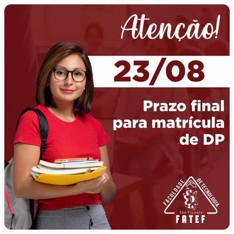 Atenção alunos!!! O prazo final para matrícula de DP é até 23/08 Para mais informações entre em contato com a secretaria da unidade.